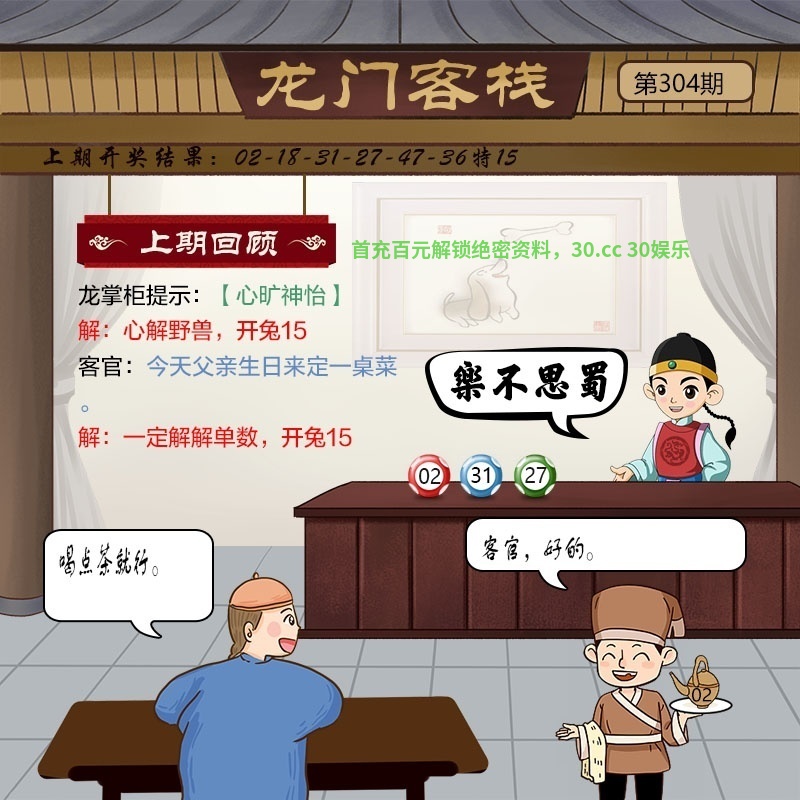 306期:龙门客栈解析 掌柜:悲憤填膺 小二:客官,客官,马上来 客官:小二,四两白酒一只鸡 解:悲憤填膺。解猪猴牛羊马兔 推荐特肖:猪猴牛羊马兔 |