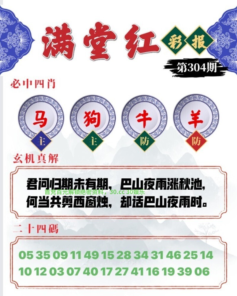 300期满堂红彩报:杨柳渡头行客稀,罟师荡桨向临圻。唯有相思似春色,江南江北送君归。 六肖:牛鸡虎马狗羊 三肖:牛鸡虎 |