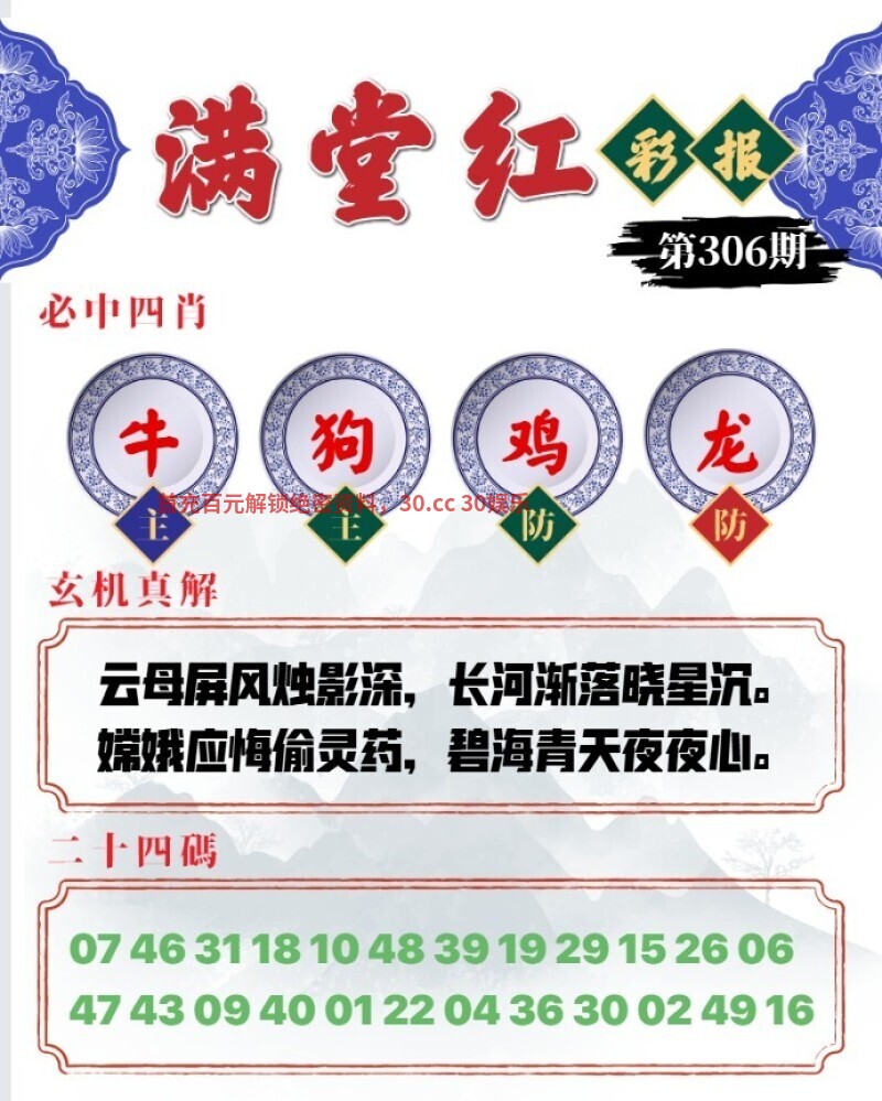 305期:龙门客栈解析 掌柜:早春时节 小二:客官,收到 客官:有点味道的酸菜 解:早春时节。解鼠狗猪虎猴鸡 推荐特肖:鼠狗猪虎猴鸡 |